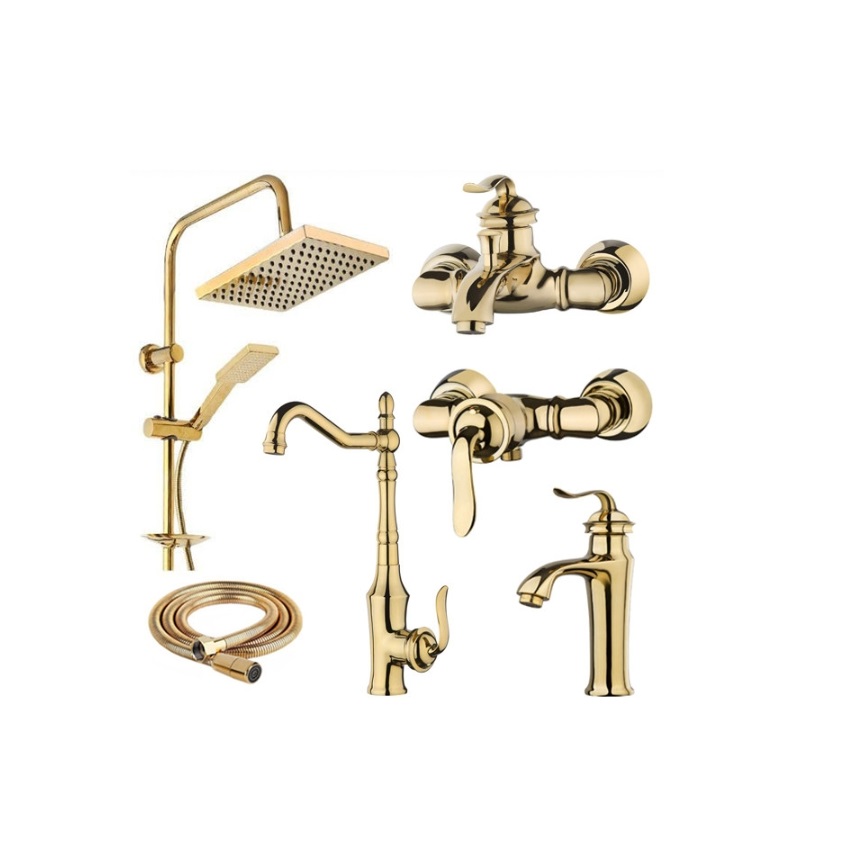 ست شیرآلات طلایی مدل هلن به همراه شلنگ توالت و دوش حمام