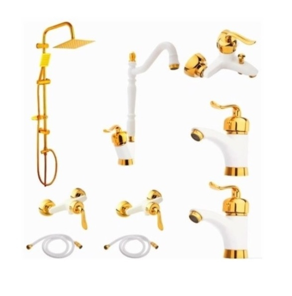 مجموعه ست ۹ تکه شیرالات سفیدطلایی مدل قاجاری بامبو به همراه علم دوش طلایی و شلنگ توالت ریزبافت